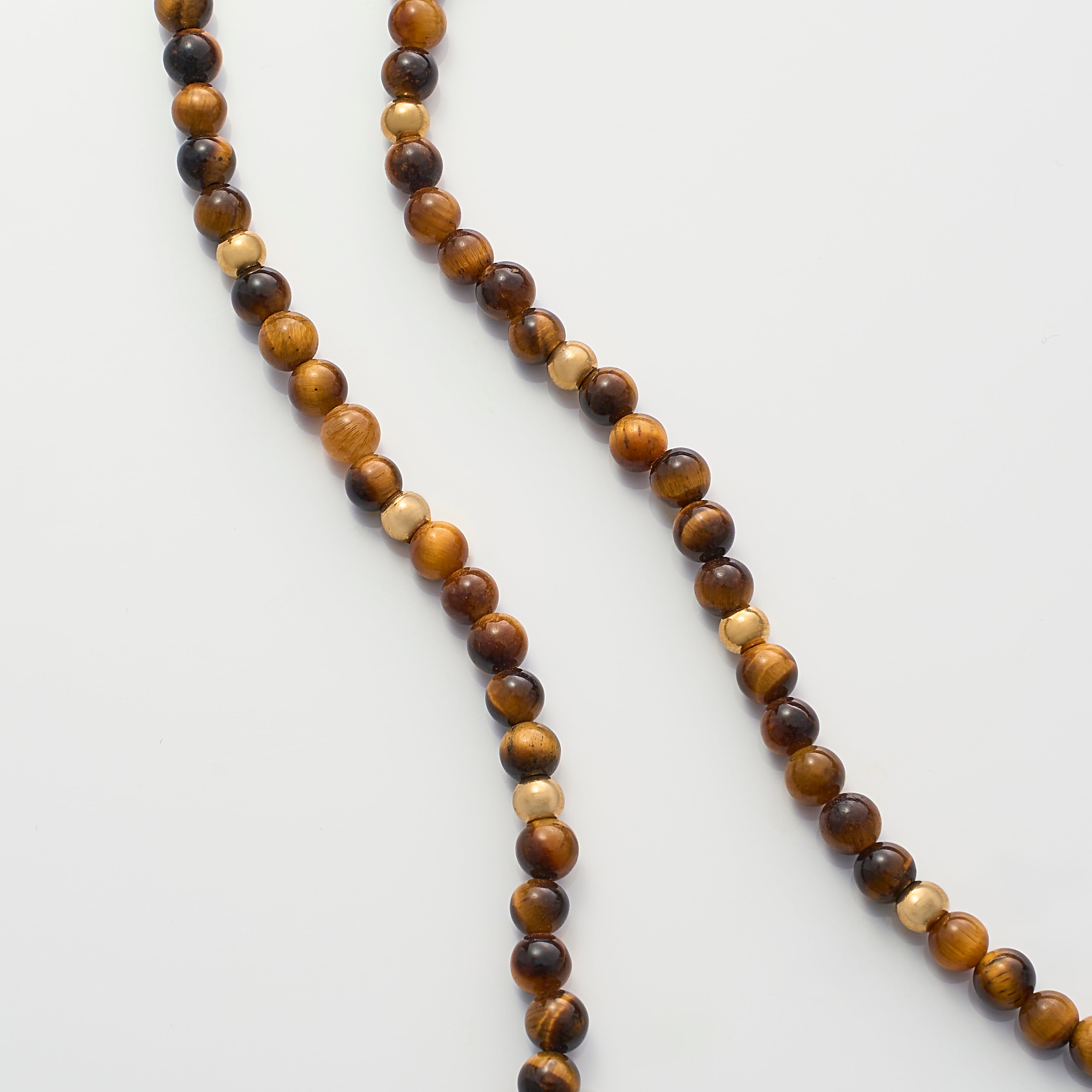 奥行きのある艶を宿した天然タイガーアイを贅沢に使用。一粒一粒を丁寧に磨き上げ、リズムを持たせたビーズネックレスに仕上げました。